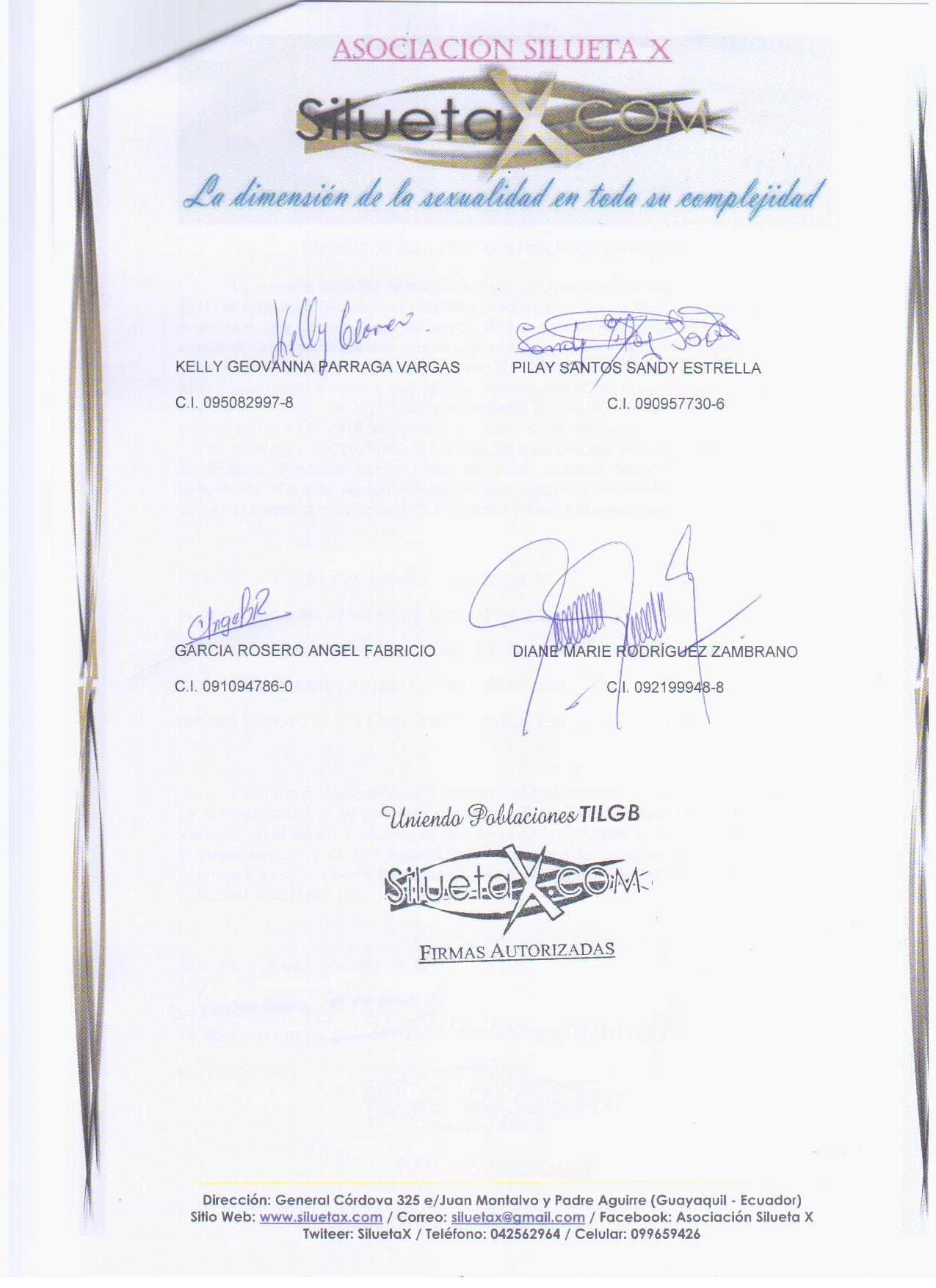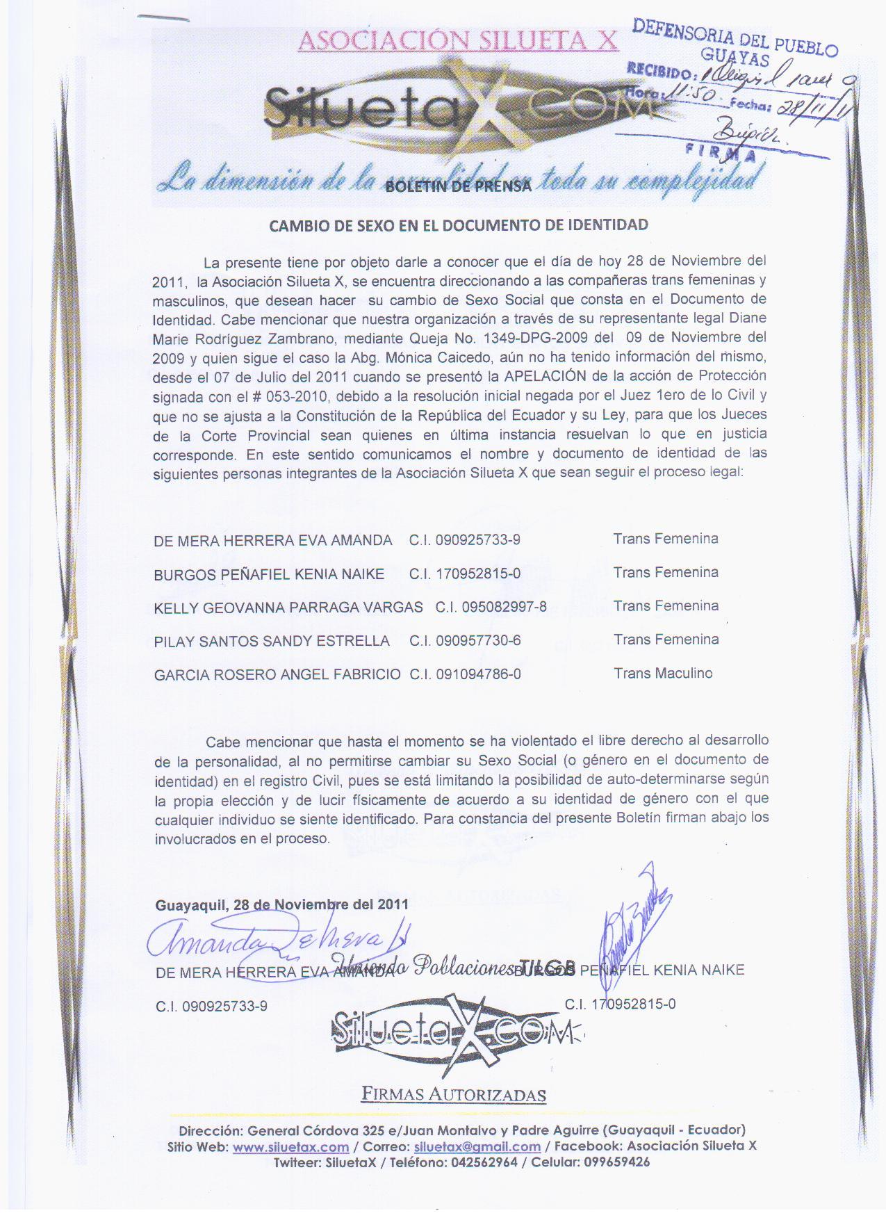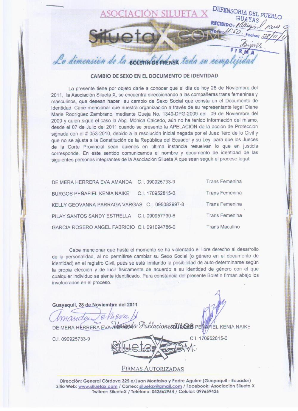 La presente tiene por objeto darle a conocer que el día de hoy 28 de Noviembre del 2011, la Asociación Silueta X, se encuentra direccionando a las compañeras trans femeninas y masculinos, que desean hacer su cambio de Sexo Social que consta en el Documento de Identidad. Cabe mencionar que nuestra organización a través de su representante legal Diane Marie Rodríguez Zambrano, mediante Queja No. 1349-DPG-2009 del 09 de Noviembre del 2009 y quien sigue el caso la Abg. Mónica Caicedo, aún no ha tenido información del mismo, desde el 07 de Julio del 2011 cuando se presentó la APELACIÓN de la acción de Protección signada con el # 053-2010, debido a la resolución inicial negada por el Juez 1ero de lo Civil y que no se ajusta a la Constitución de la República del Ecuador y su Ley, para que los Jueces de la Corte Provincial sean quienes en última instancia resuelvan lo que en justicia corresponde. En este sentido comunicamos el nombre y documento de identidad de las siguientes personas integrantes de la Asociación Silueta X que sean seguir el proceso legal:
