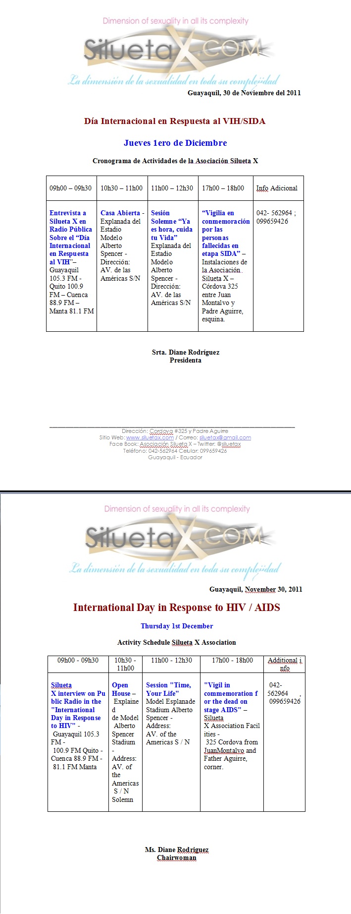 “Vigilia en conmemoración por las personas fallecidas en etapa SIDA” – Instalaciones dela Asociación Silueta X – Córdova 325 entre Juan Montalvo y Padre Aguirre, esquina. | 042- 562964 ; 099659426 |