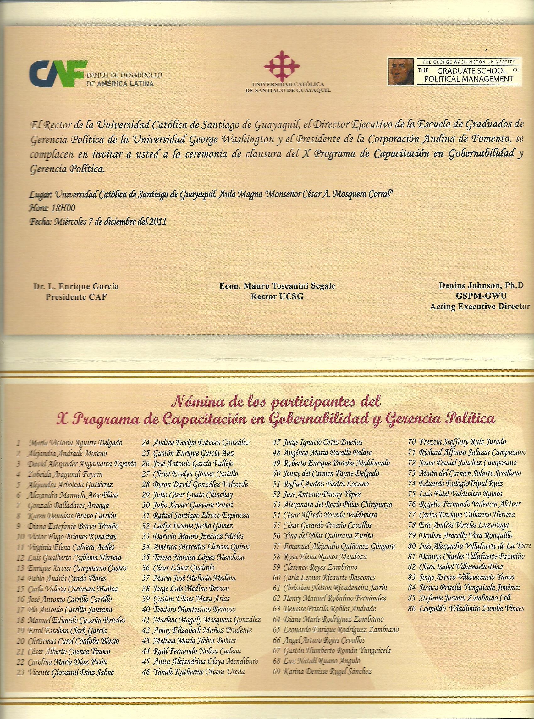 The Catholic University of Santiago de Guayaquil, through the Directorate of Continuing Education, in partnership with the Graduate School of Political Management at George Washington and the Andean Development Corporation, are committed to train leaders and political leaders / as, members of senior and middle of the municipalities of the provincial governments and NGOs, as key players in the maintenance of democracy and governance.