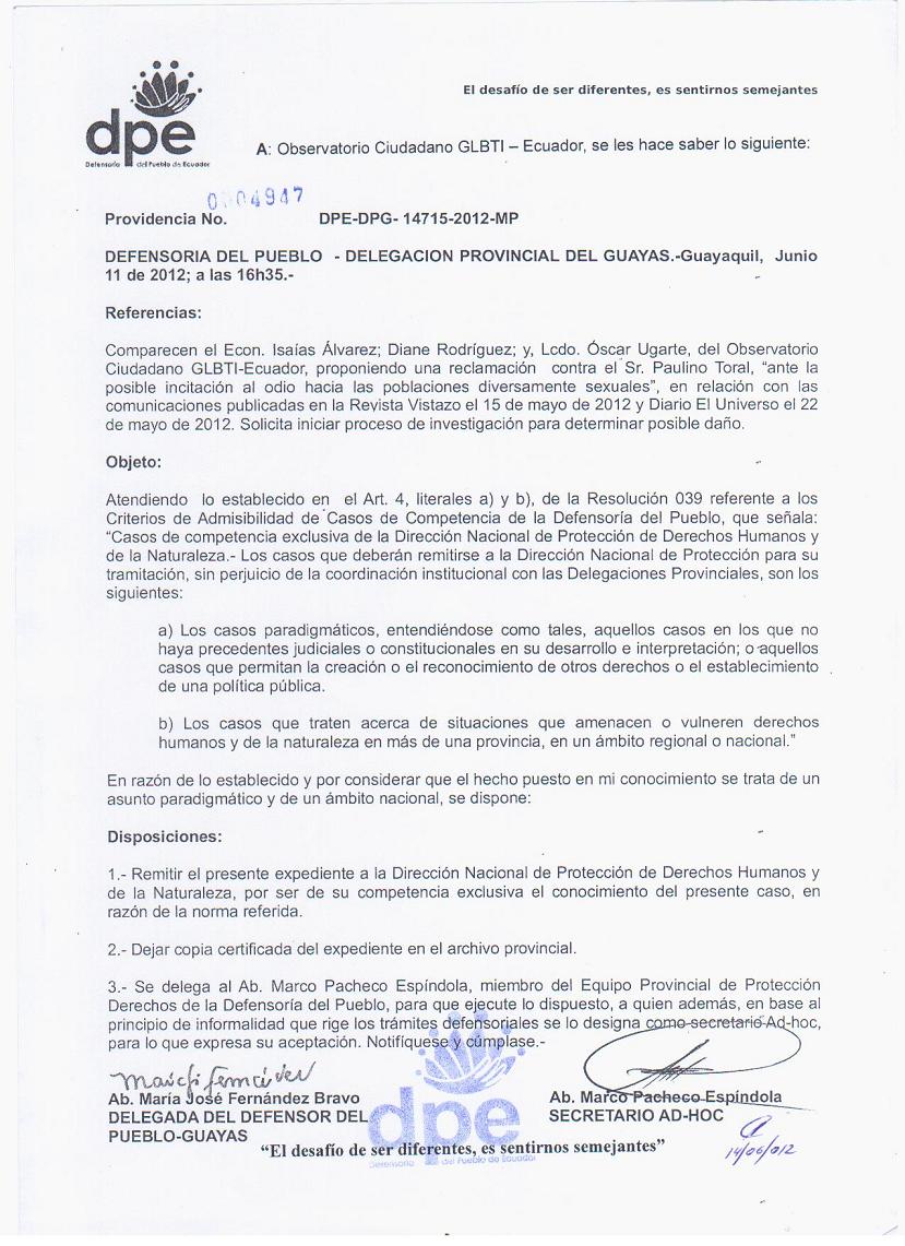 El Observatorio GLBTI del Ecuador informa que la Defensoría del Pueblo de Guayaquil Traslada las quejas legales en contra del Padre Paulino Toral y Columnista Miguel Macías a la “Dirección Nacional de Protección de Derechos Humanos” de Quito, por asegurar la competencia a este departamento, según comunicado emitido por la misma institución y firmada porla Abg. María José Fernández (Delegada del Defensor del Pueblo en Guayaquil) y el Abg. Marco Pacheco.