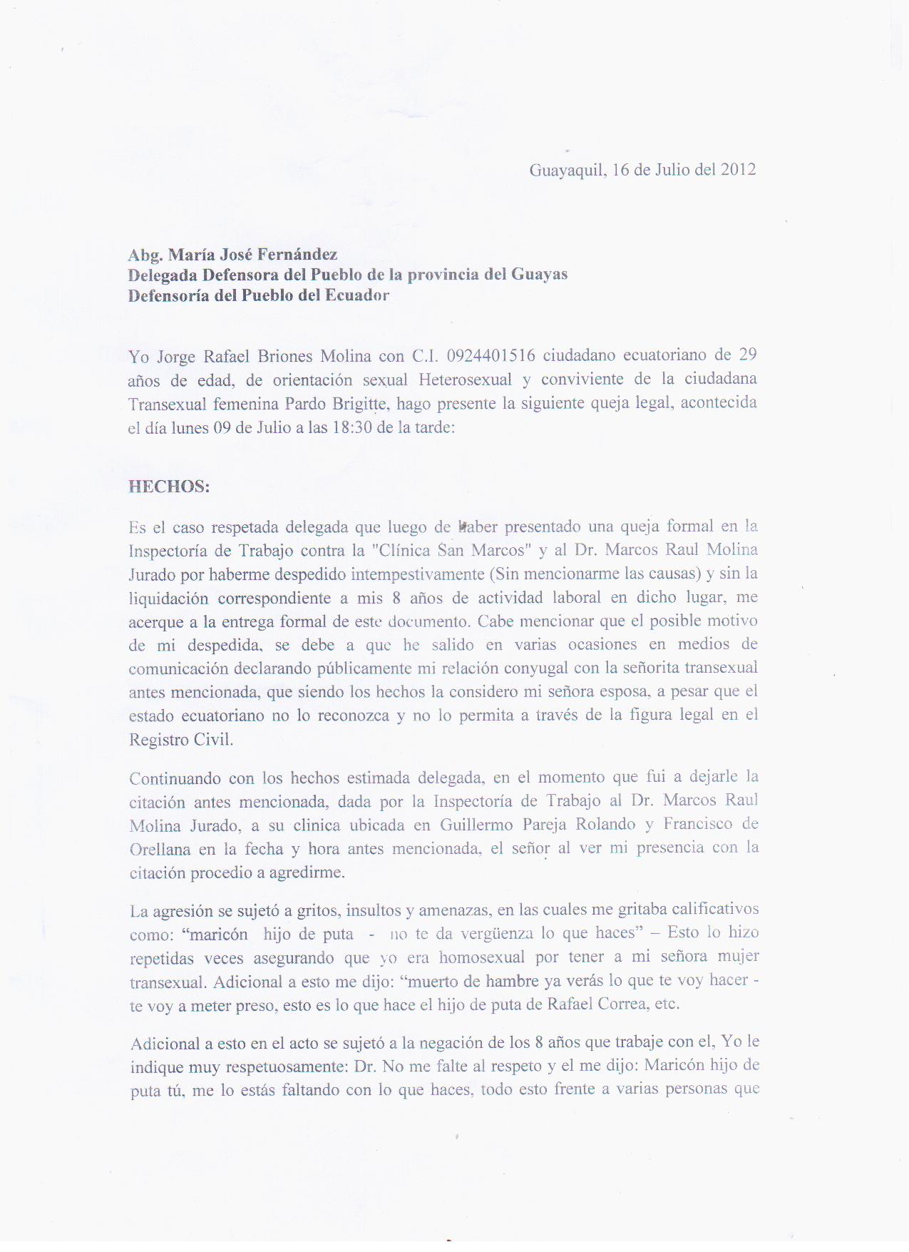 Es el caso respetada delegada que luego de haber presentado una queja formal en la Inspectoría de Trabajo contra la «Clínica San Marcos» y al Dr. Marcos Raul Molina Jurado por haberme despedido intempestivamente (Sin mencionarme las causas) y sin la liquidación correspondiente a mis 8 años de actividad laboral en dicho lugar, me acerque a la entrega formal de este documento. Cabe mencionar que el posible motivo de mi despedida, se debe a que he salido en varias ocasiones en medios de comunicación declarando públicamente mi relación conyugal con la señorita transexual antes mencionada, que siendo los hechos la considero mi señora esposa, a pesar que el estado ecuatoriano no lo reconozca y no lo permita a través de la figura legal en el Registro Civil.
