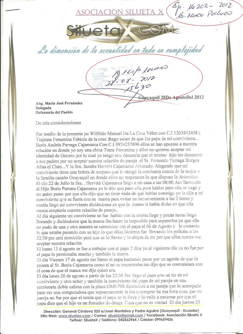 Silueta X, asesoró a Fabiola de la Cruz, para que pusiera una Queja Legal, pues existe la posibilidad que a su conviviente, sus mismos padres lo hayan internado en una clínica de des-homosexualización (Que resulta ilógico puesto que Borís Párraga se siente atraído a su pareja Trans por sus caracteres femeninos). Esto, por declaraciones del mismo Borís Párraga, cuando lo intentaron internar la 1era vez.