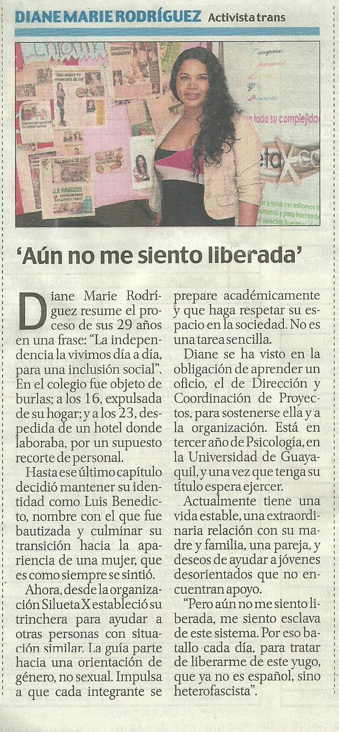 Está en tercer año de Psicología, en la Universidad de Guayaquil, y una vez que tenga su título espera ejercer. Actualmente tiene una vida estable, una extraordinaria relación con su madre y familia, una pareja, y deseos de ayudar a jóvenes desorientados que no encuentran apoyo. “Pero aún no me siento liberada, me siento esclava de este sistema. Por eso batallo cada día, para tratar de liberarme de este yugo, que ya no es español, sino heterofascista”.