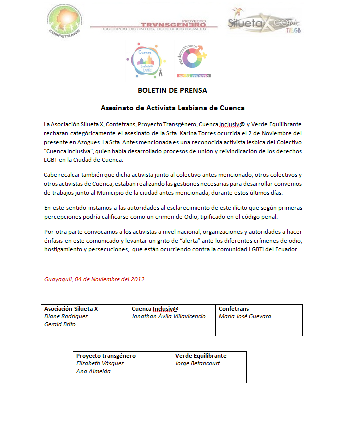 La Asociación Silueta X, Confetrans, Proyecto Transgénero, Cuenca Inclusiv@ y Verde Equilibrante rechazan categóricamente el asesinato de la Srta. Karina Torres ocurrida el 2 de Noviembre del presente en Azogues. La Srta. Antes mencionada es una reconocida activista lésbica del Colectivo “Cuenca Inclusiva”, quien había desarrollado procesos de unión y reivindicación de los derechos LGBT en la Ciudad de Cuenca.