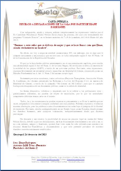 Con indignación, arcada y estupor, rechazo categóricamente las expresiones vertidas por el Ex Candidato Presidencial Pastor Nelson Zavala hacia mi persona, del cual cito textualmente del programa “Contacto Directo”, en su horario matutino de 7 a 8 de la mañana, del 14 de Marzo del año 2013: