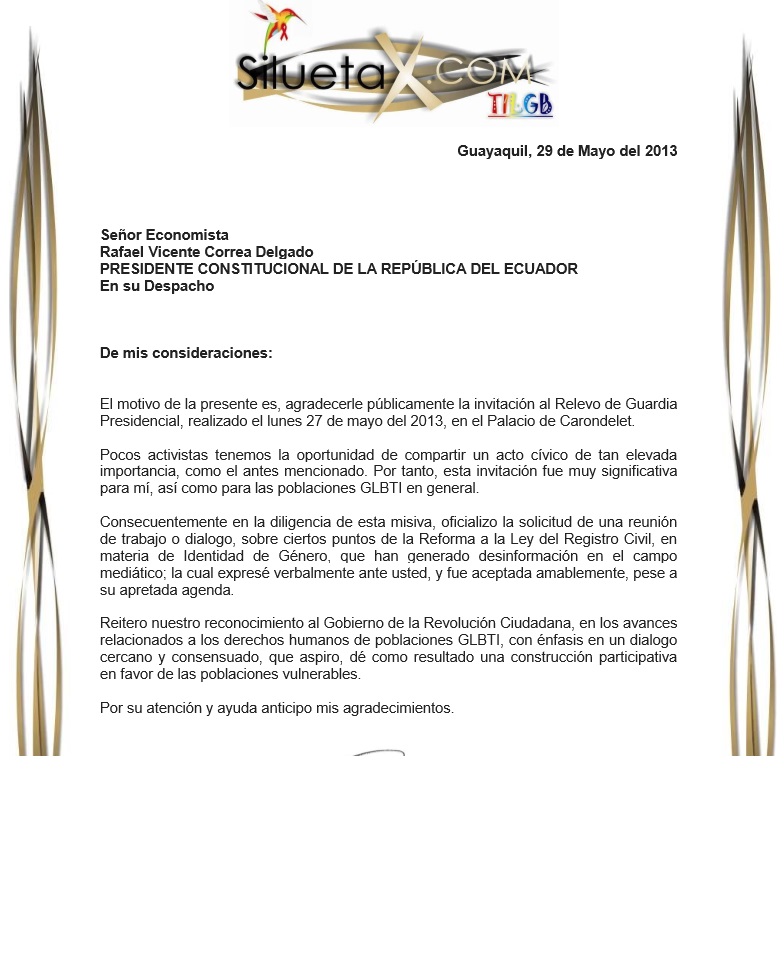 Reitero nuestro reconocimiento al Gobierno de la Revolución Ciudadana, en los avances relacionados a los derechos humanos de poblaciones GLBTI, con énfasis en un dialogo cercano y consensuado, que aspiro, dé como resultado una construcción participativa en favor de las poblaciones vulnerables.
