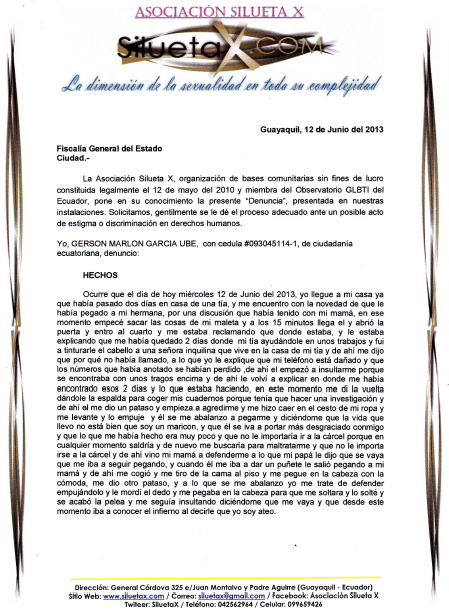 La Asociación Silueta X, organización de bases comunitarias sin fines de lucro constituida legalmente el 12 de mayo del 2010 y miembro del Observatorio GLBTI del Ecuador, pone en su conocimiento la presente “Denuncia”, presentada en nuestras instalaciones. Solicitamos, gentilmente se le dé el proceso adecuado ante un posible acto de estigma o discriminación en derechos humanos.