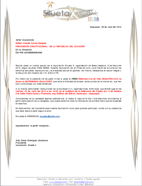 Reciba usted un cordial saludo de la Asociación Silueta X, organización de Base creada el 12 de Mayo del 2010, según acuerdo MIES #9989. Nuestra Asociación es sin fines de lucro, cuya misión es la lucha por los derechos sexuales, reproductivos y la diversidad sexual en general. Así mismo, trabajamos en salud integral y la reducción del impacto del VIH, SIDA e ITS.
