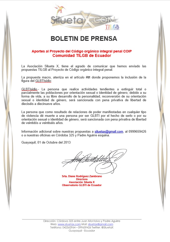 La Asociación Silueta X, tiene el agrado de comunicar que hemos enviado las propuestas TILGB al Proyecto de Código orgánico integral penal.