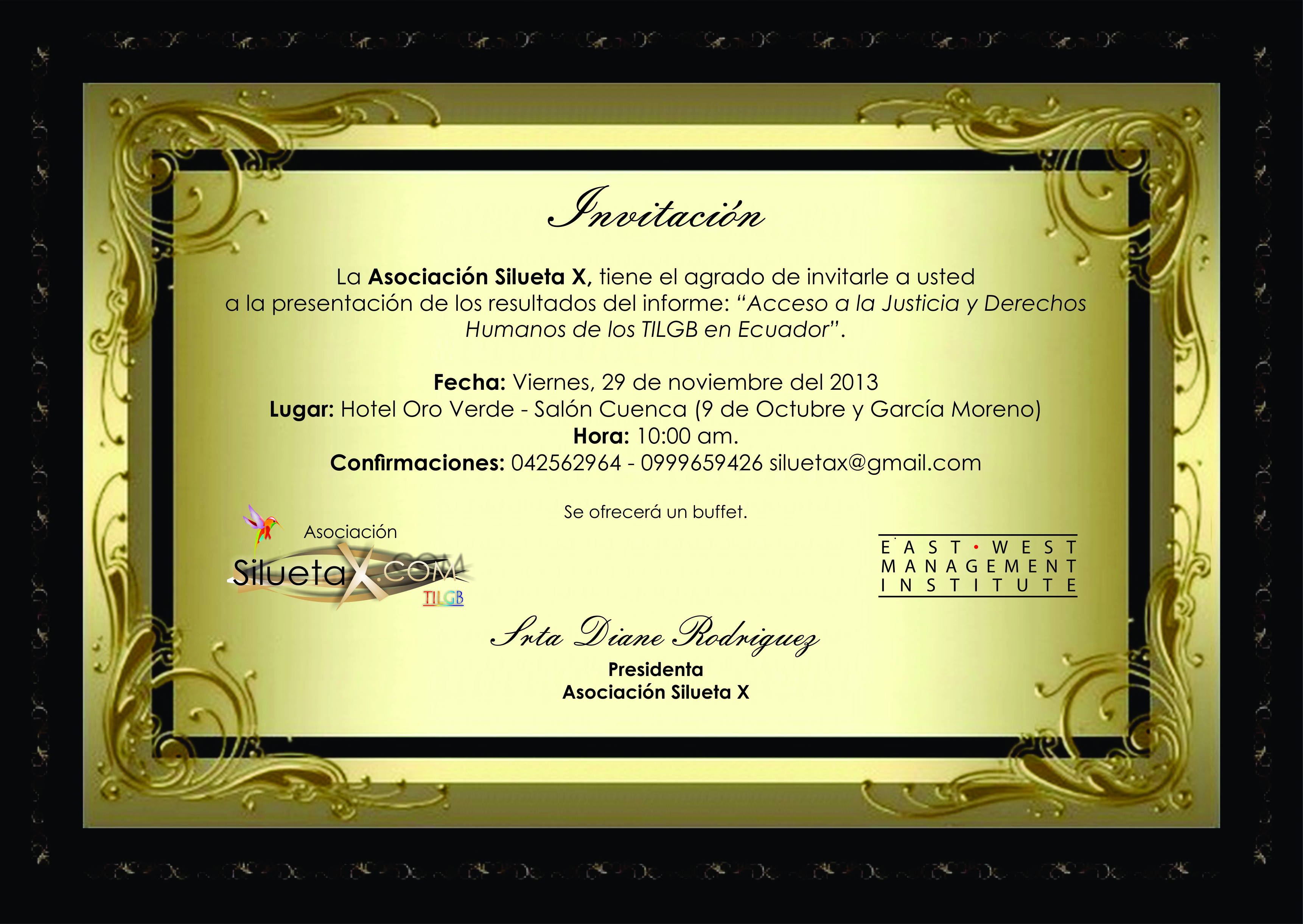 La Asociación Silueta X tiene el agrado de invitarle A LOS MEDIOS DE COMUNICACIÓN a la presentación de los resultados del informe: «Acceso a la Justicia y Derechos Humanos de los/las TILGB (Transexuales, intersexuales, Lesbianas, Gays y Bisexuales) en Ecuador».