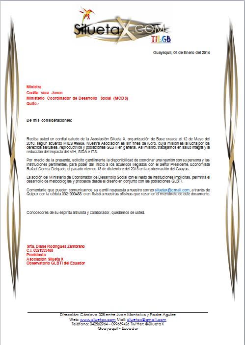 Reciba usted un cordial saludo de la Asociación Silueta X, organización de Base creada el 12 de Mayo del 2010, según acuerdo MIES #9989. Nuestra Asociación es sin fines de lucro, cuya misión es la lucha por los derechos sexuales, reproductivos y poblaciones GLBTI en general. Así mismo, trabajamos en salud integral y la reducción del impacto del VIH, SIDA e ITS.