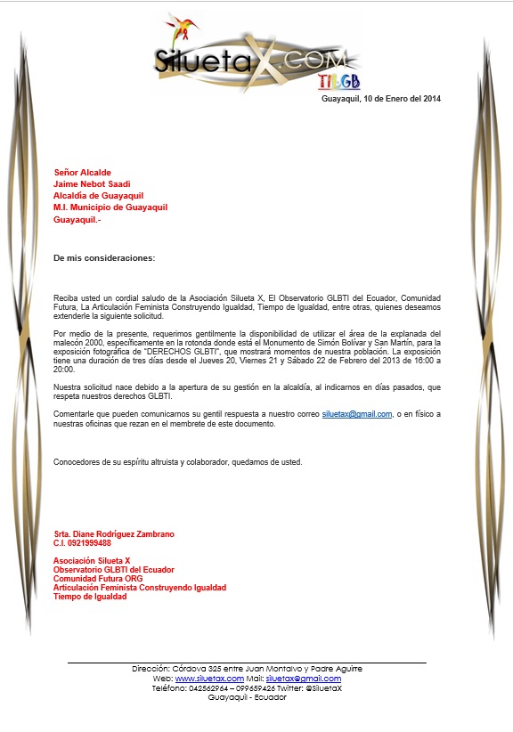 Reciba usted un cordial saludo de la Asociación Silueta X, El Observatorio GLBTI del Ecuador, Comunidad Futura, La Articulación Feminista Construyendo Igualdad, Tiempo de Igualdad, entre otras, quienes deseamos extenderle la siguiente solicitud.