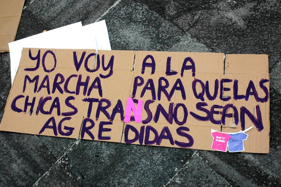 2. Frente a la represión que sufren l@s trans y otras personas que asumen expresiones de género alternativas; NOS VESTIMOS PUTAS. Una diversidad de géneros encabeza nuestra marcha porque reivindicamos la libertad estética y la diversidad de género como cuestión transfeminista. Porque pensamos que ni el feminismo es exclusivo de las mujeres, ni la transgresión del género es exclusiva de las personas trans. Y por eso reivindicamos todas aquellas expresiones de género que rompen con la estética binaria y patriarcal que nos dibuja un mundo de dos lugares únicos: el de las «mujeres femeninas» y el de los «hombres masculinos». Y celebramos la subversión estética, tan encarnada en la híper feminidad de la puta y en la del gay que «echa plumas», como en la masculinidad de las mujeres machonas o en la de los hombres que nacieron con vagina; o aún, en la androginia de quienes se niegan a asumir una expresión de género inequívoca.