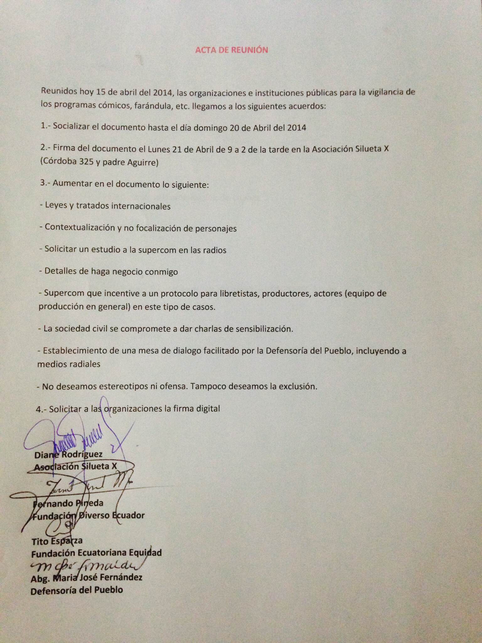 Las organizaciones y sus representantes que deseen firmar el documento, podrán realizarlo el lunes 21 de abril del 2014 de 08:30Am a 14:00PM. Luego de esta hora la queja legal será presentada al organismo competente.