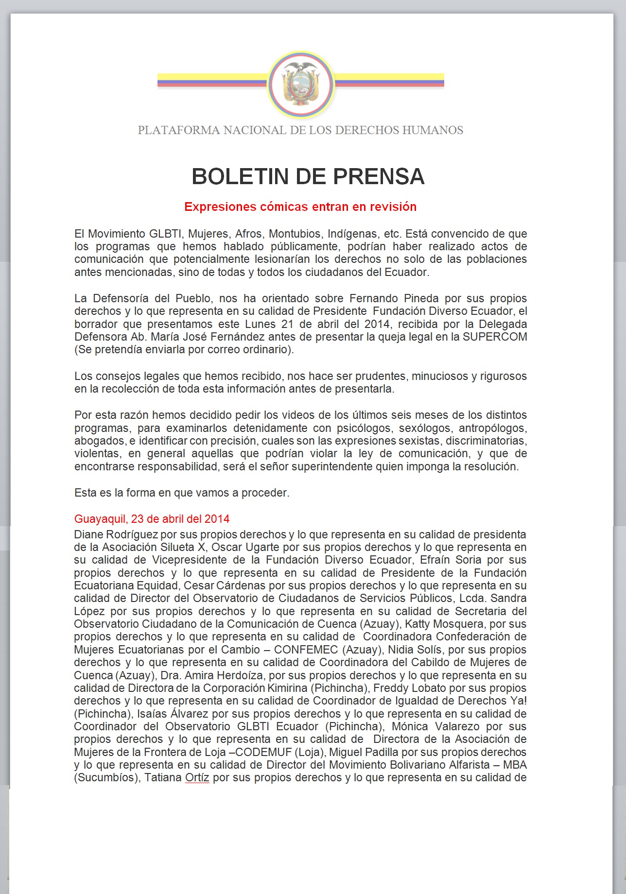 La Defensoría del Pueblo, nos ha orientado sobre Fernando Pineda por sus propios derechos y lo que representa en su calidad de Presidente Fundación Diverso Ecuador, el borrador que presentamos este Lunes 21 de abril del 2014, recibida por la Delegada Defensora Ab. María José Fernández antes de presentar la queja legal en la SUPERCOM (Se pretendía enviarla por correo ordinario).