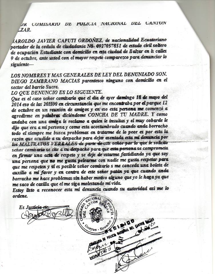 Adjunto que el señor DIEGO ZAMBRANO MACIAS en un claro intento por perjudicarme a realizado los trámites pertinentes para que me saquen una boleta de citación (CONTRADENUNCIA)