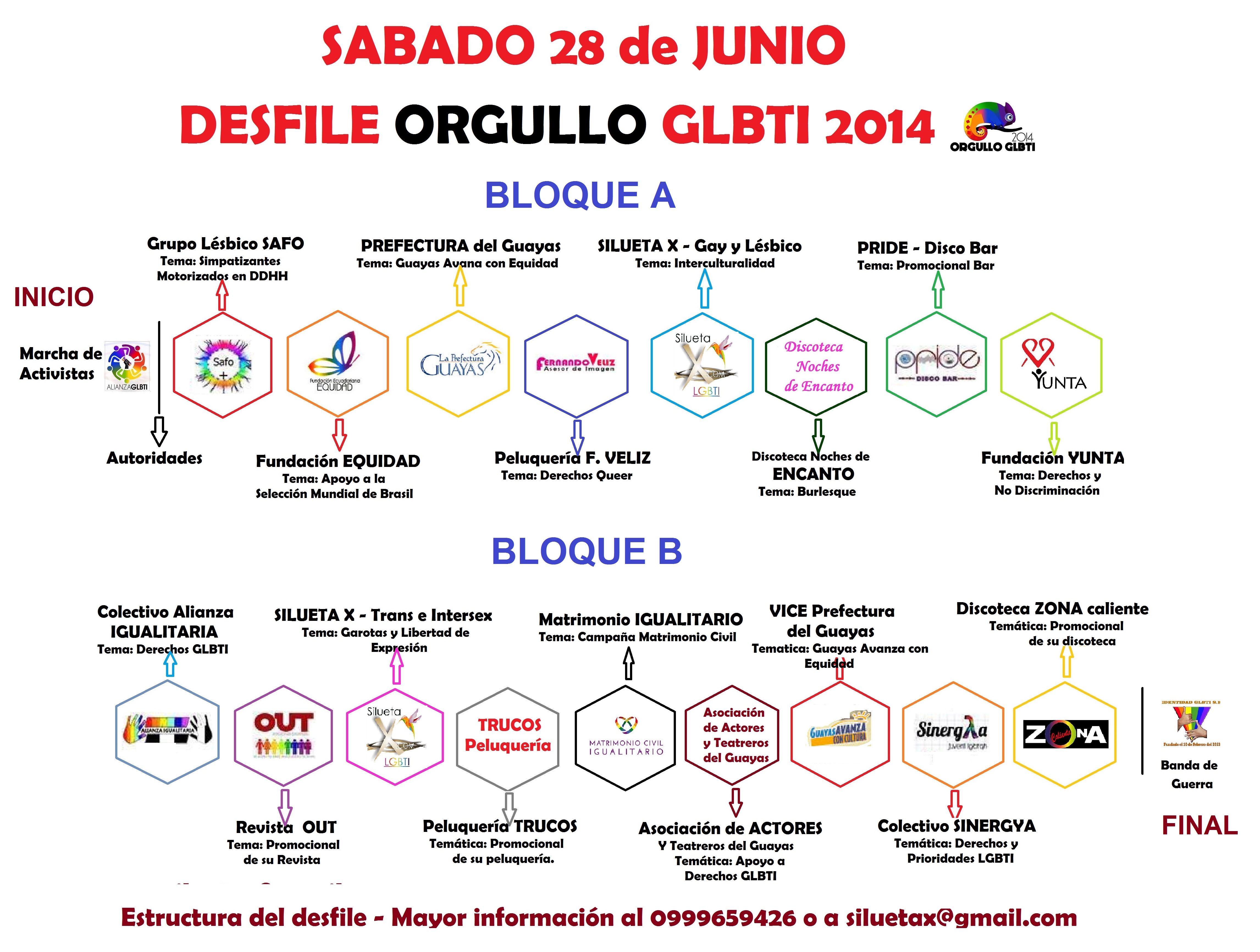 Por medio de la presente damos a conocer que La Asociación Silueta X, es la organización coordinadora del DESFILE DEL ORGULLO Y DIVRSIDAD SEXUAL 2014, que tendrá lugar este sábado 28 de junio del 2014 a las 15:00 en la ciudad de Guayaquil, que partirá desde la bahía y concluirá en el parque centenario en el Festival de Cultura GLBTI coordinado por nuestros colegas de la fundación Yunta.