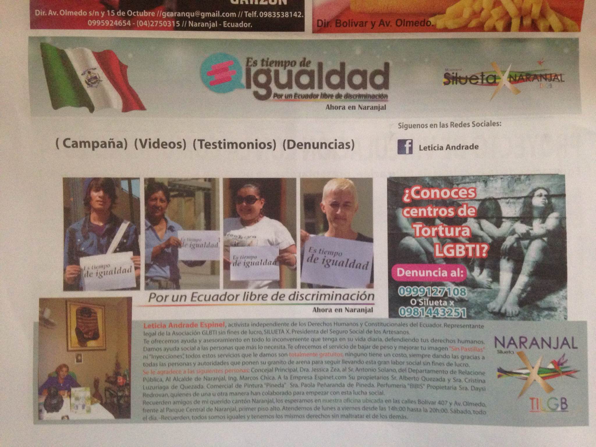 Leticia Andrade Espinel, activista independiente de los derechos Humanos y constitucionales del Ecuador, representantes legal de la Asociación GLBTI sin fines de lucro, SiluetaX, presidenta del seguro social de los Artesanos.
