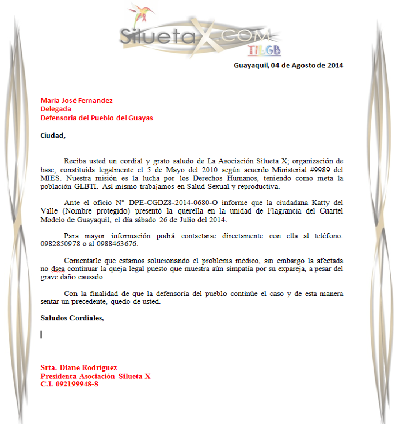 Reciba usted un cordial y grato saludo de La Asociación Silueta X; organización de base, constituida legalmente el 5 de Mayo del 2010 según acuerdo Ministerial #9989 del MIES. Nuestra misión es la lucha por los Derechos Humanos, teniendo como meta la población GLBTI. Así mismo trabajamos en Salud Sexual y reproductiva.