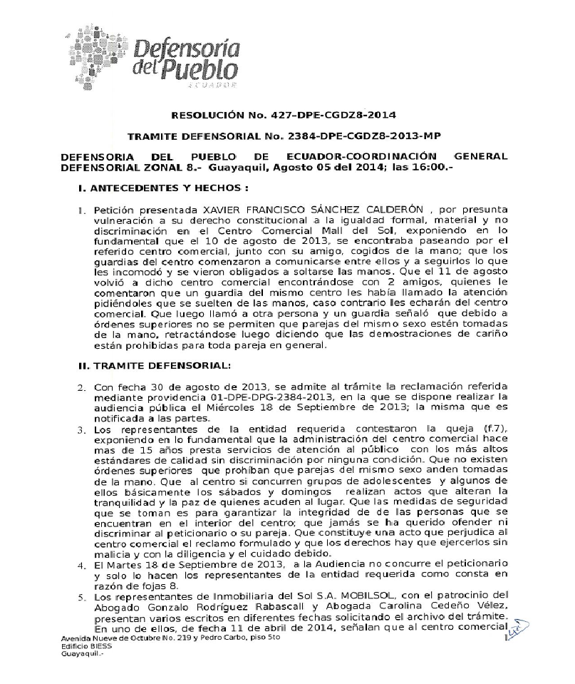I. Petición presentada XAVIER FRANCISCO SANCHEZ CALDERON, por presunta vulneracion a su derecho constitucional a la igualdad formal, material y no discriminatorio en el centro comercial Mall del Sol, exponiendo en lo fundamental que el 1 de agosto de 2013, se encontraba paseando por el referido centro comercial, junto con su amigo, cogidos de la mano; que los guardias del centro comenzaron a comunicarse entre ellos y a seguirlos lo que les incomodo y se vieron obligados a soltarse las manos. Que el 11 de Agosto volvió a dicho centro comercial encontrándose con 2 amigos, quienes le comentaron que un guardia del mismo centro les había llamado la atención pidiéndoles que se suelten de las manos, caso contrario les echaran del centro comercial. Que luego llamo a otra persona y un guardia señalo que debido a ordenes superiores no se permiten que parejas del mismo sexo estén tomadas de la mano, retractándose luego diciendo que las demostraciones de cariño están prohibidas para toda pareja en general.
