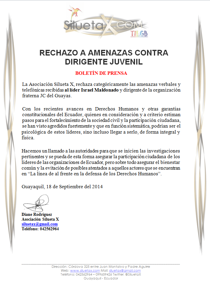 La Asociación Silueta X, rechaza categóricamente las amenazas verbales y telefónicas recibidas al líder Israel Maldonado (Telf.: 0999217085) y dirigente de la organización fraterna JCE del Guayas.