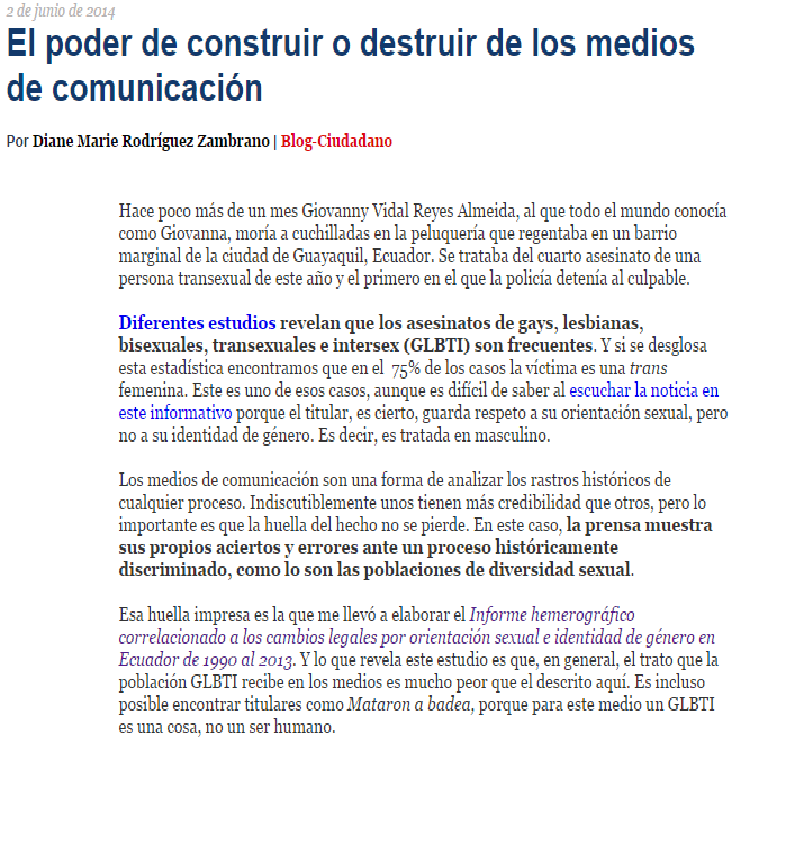 That print is printed which led me to develop the report hemerográfico correlated to changes in the law on sexual orientation and gender identity in Ecuador from 1990 to 2013 And what this study reveals is that, in general, the treatment population GLBTI receives in the media is far worse than described here. It is even possible to find headlines like badea killed because one GLBTI for this medium is a thing, not a human.