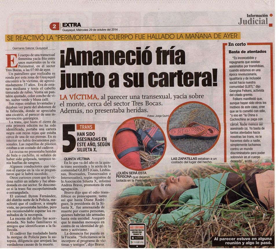 En lo que va del año es la quinta trans asesinada y la sexta de la comunidad GLBTI(GAYS, LESBIANAS, BISEXUALES, TRANSEXUALES e INTERSEXUALES), según registros de la Asociación Silueta X, informó, Andrea Bravo, promotora de esta agrupación.