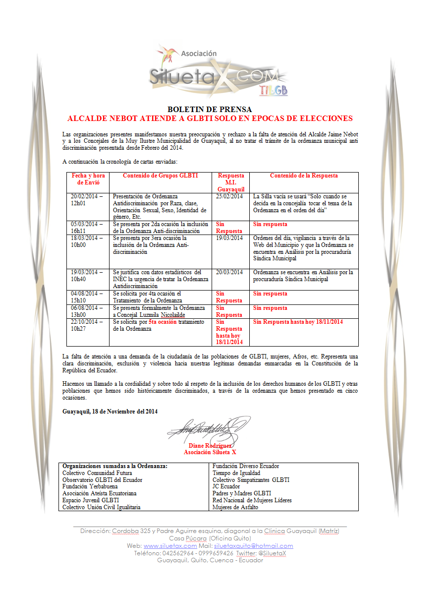 Las organizaciones presentes manifestamos nuestra preocupación y rechazo a la falta de atención del Alcalde Jaime Nebot y a los Concejales de la Muy Ilustre Municipalidad de Guayaquil, al no tratar el trámite de la ordenanza municipal anti discriminación presentada desde Febrero del 2014.