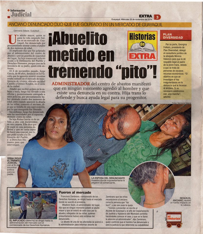 El implicado dijo que fue golpeado por el administrador del centro de abastos y por un guardia de seguridad del lugar. Su hija transexual solicito ayuda a la defensoria del pueblo y Derechos Humanos, por que cree en la inocencia de su padre, quien esta enfermo.