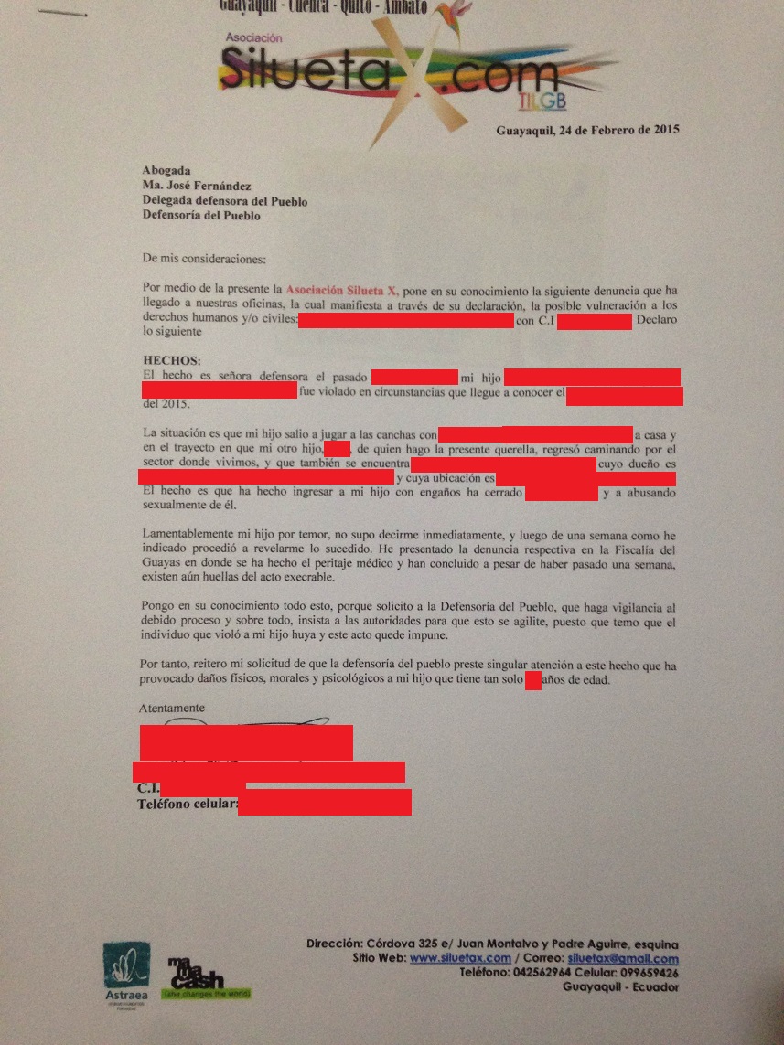Pongo en su conocimiento todo esto, porque solicito a la Defensoría del Pueblo, que haga vigilancia al debido proceso y sobre todo, insista a las autoridades para que esto se agilite, puesto que temo que el individuo que violó a mi hijo huya y este acto quede impune.