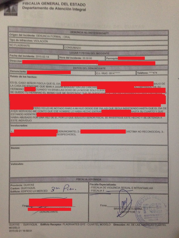 Lamentablemente mi hijo por temor, no supo decirme inmediatamente, y luego de una semana como he indicado procedió a revelarme lo sucedido. He presentado la denuncia respectiva en la Fiscalía del Guayas en donde se ha hecho el peritaje médico y han concluido a pesar de haber pasado una semana, existen aún huellas del acto execrable.
