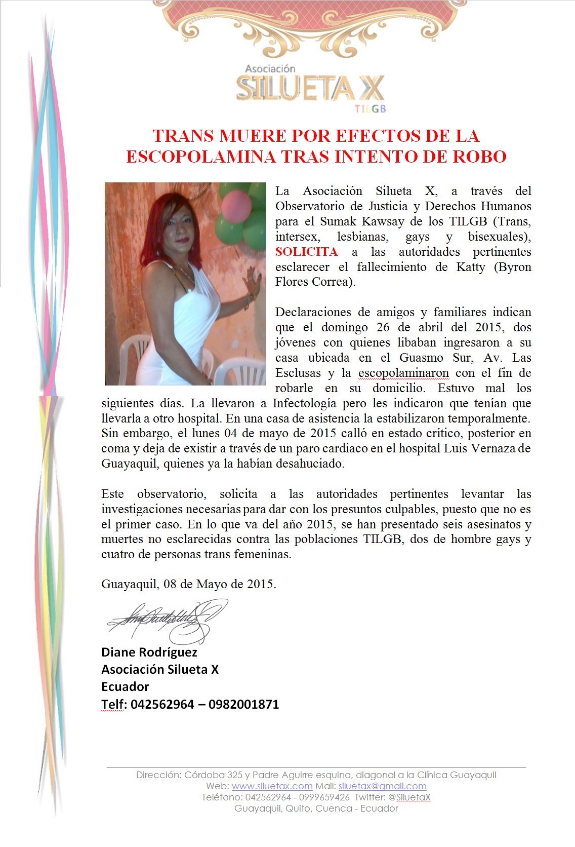 La Asociación Silueta X, a través del Observatorio de Justicia y Derechos Humanos para el Sumak Kawsay de los TILGB (Trans, intersex, lesbianas, gays y bisexuales), SOLICITA a las autoridades pertinentes esclarecer el fallecimiento de Katty (Byron Flores Correa).