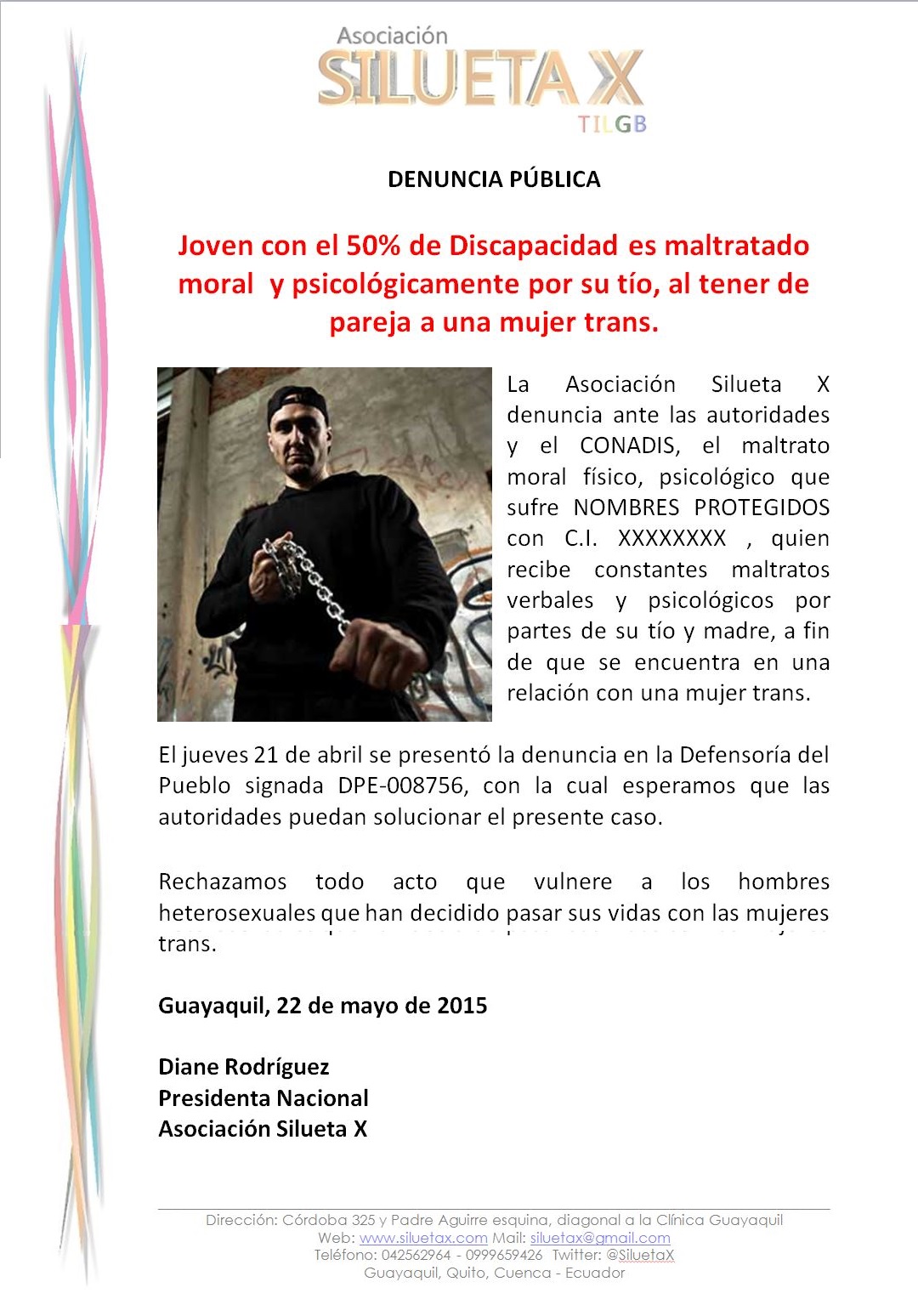 La Asociación Silueta X denuncia ante las autoridades y el CONADIS, el maltrato moral físico, psicológico que sufre NOMBRES PROTEGIDOS con C.I. XXXXXXXX , quien recibe constantes maltratos verbales y psicológicos por partes de su tío y madre, a fin de que se encuentra en una relación con una mujer trans.