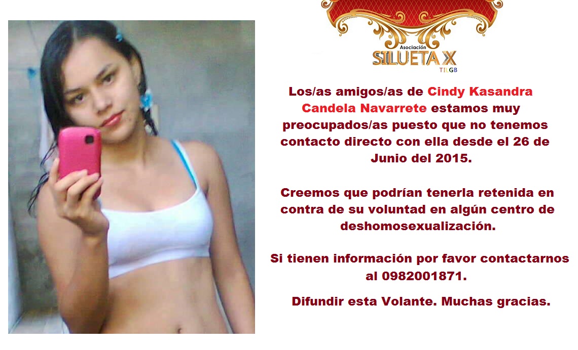 Los/as amigos/as de Cindy Kasandra Candela Navarrete, estamos muy preocupados/as porque no tenemos contacto directo con ella desde el 26 de Junio del 2015 en Guayaquil – Ecuador.
