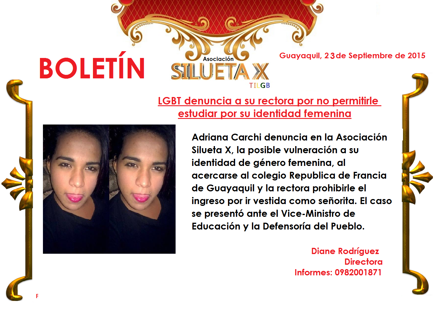 Me identifico como una transexual femenina, por lo cual he decidido adoptar mi rol de género femenino, sin embargo la rectora del Colegio Sonia Loor me prohibió el ingreso al percatarse que fui vestida con atuendos femeninos el pasado 7 de septiembre de 2015. Manifesté también que había sido expulsada de mi hogar por mi identidad de género femenina, sin embargo no me ofrecieron apoyo psicológico por parte la directora del DECE Dra. Aura Camacho, sino más bien estigma para que me acerque con atuendos masculinos. Adicional recibí maltrato a mi identidad de género por parte de Máster Edita Cedeño.