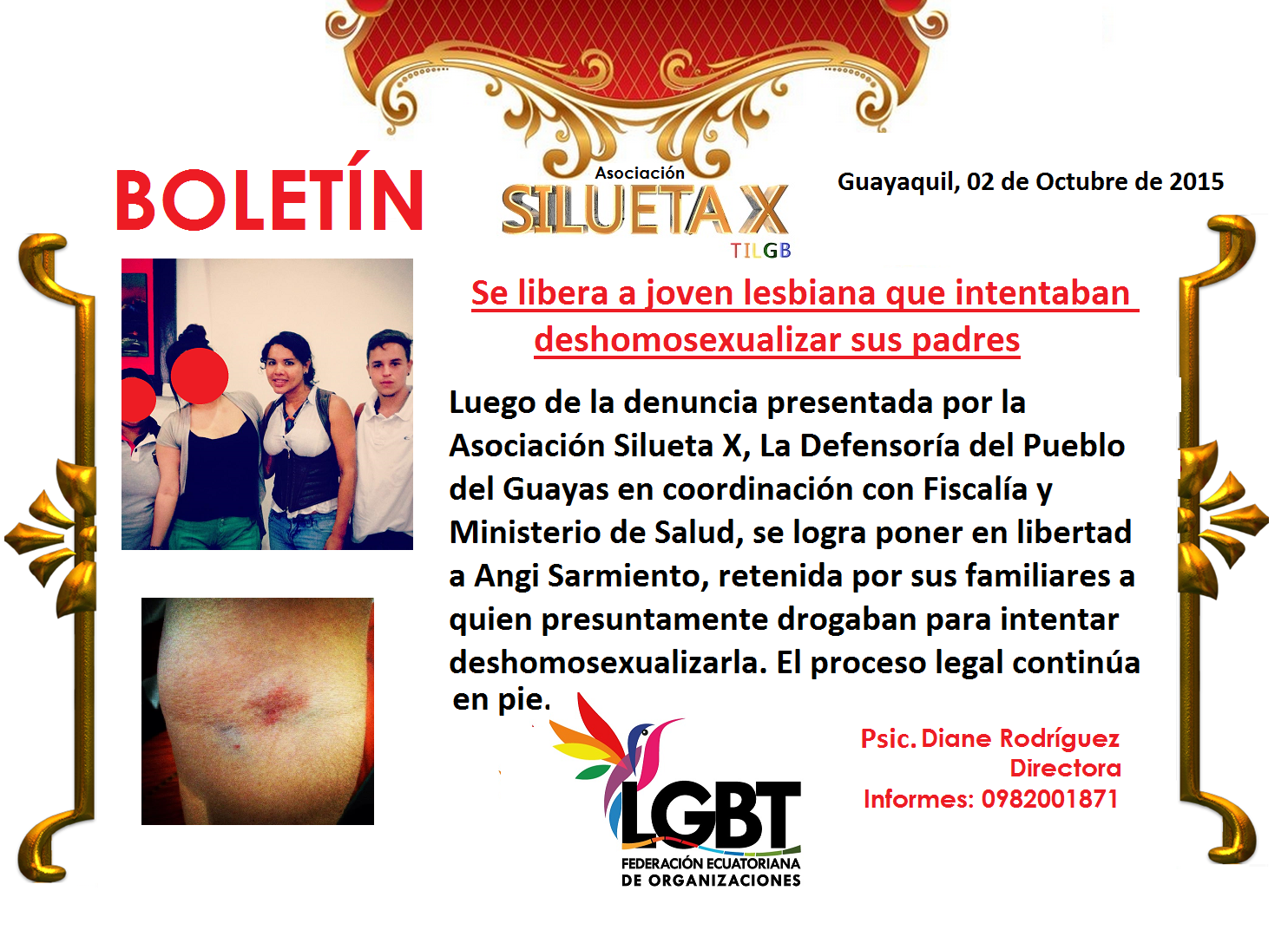 Luego de la denuncia presentada por la Asociación Silueta X, La Defensoría del Pueblo del Guayas en coordinación con Fiscalía y Ministerio de Salud, se logra poner en libertad a Angi Sarmiento, retenida por sus familiares a quien presuntamente drogaban para intentar deshomosexualizarla. El proceso legal continúa en pie.