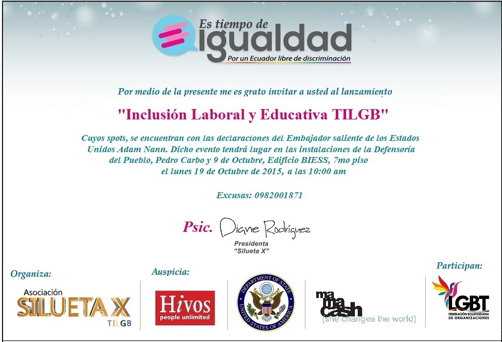 Through this I am pleased to invite you to the presentation of the spots of the inclusion work and education campaign statements made with outgoing US Ambassador in Ecuador, Adam Nann. The event will take place at the premises of the Ombudsman, in Pedro Carbo and October 9, BIESS Building, 7th floor, monday 19 octuber, at 10:00 am. 0982001871 excuses.