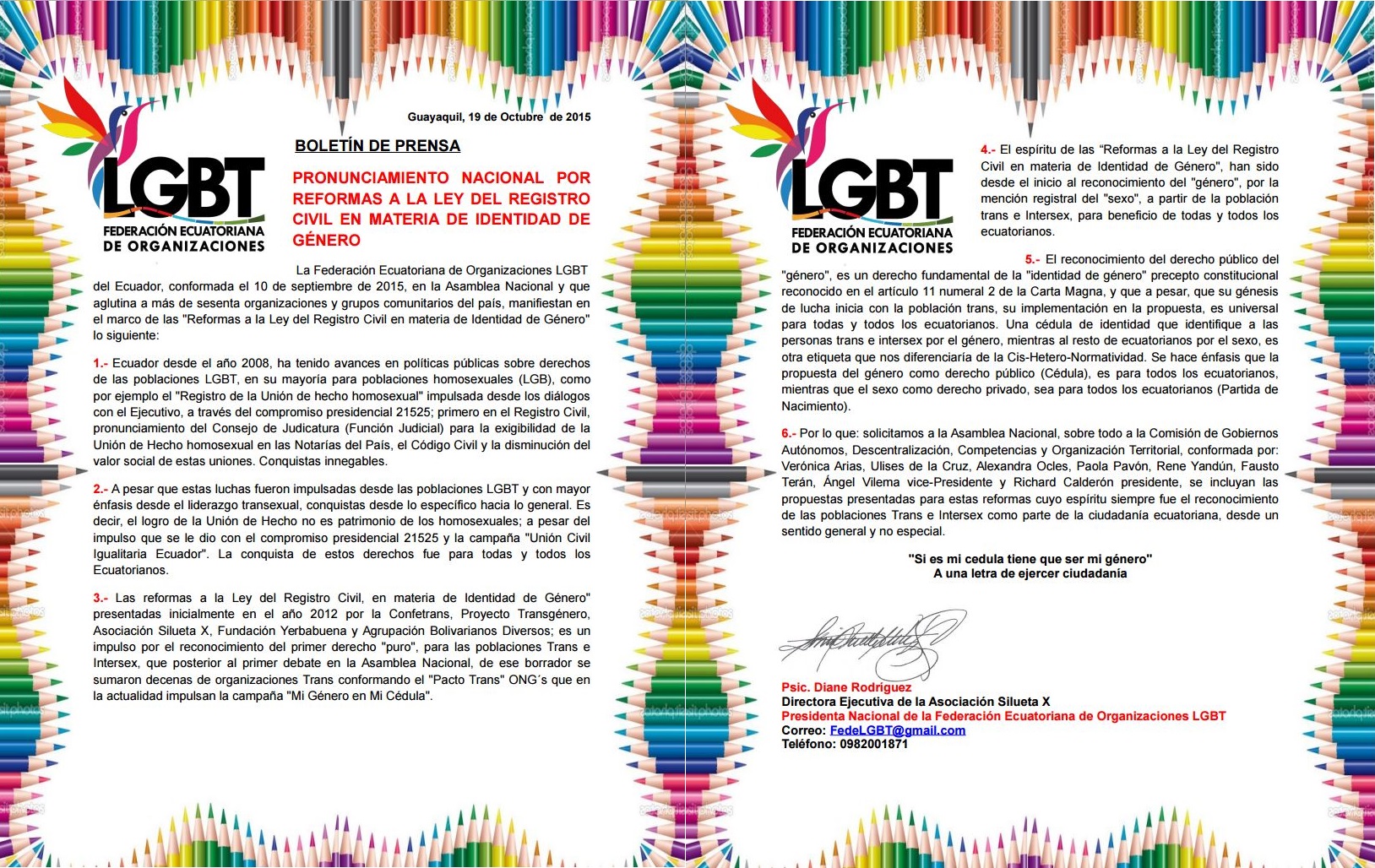 La Federación Ecuatoriana de Organizaciones LGBT del Ecuador, conformada el 10 de septiembre de 2015, en la Asamblea Nacional y que aglutina a más de sesenta organizaciones y grupos comunitarios del país, manifiestan en el marco de las «Reformas a la Ley del Registro Civil en materia de Identidad de Género» lo siguiente: