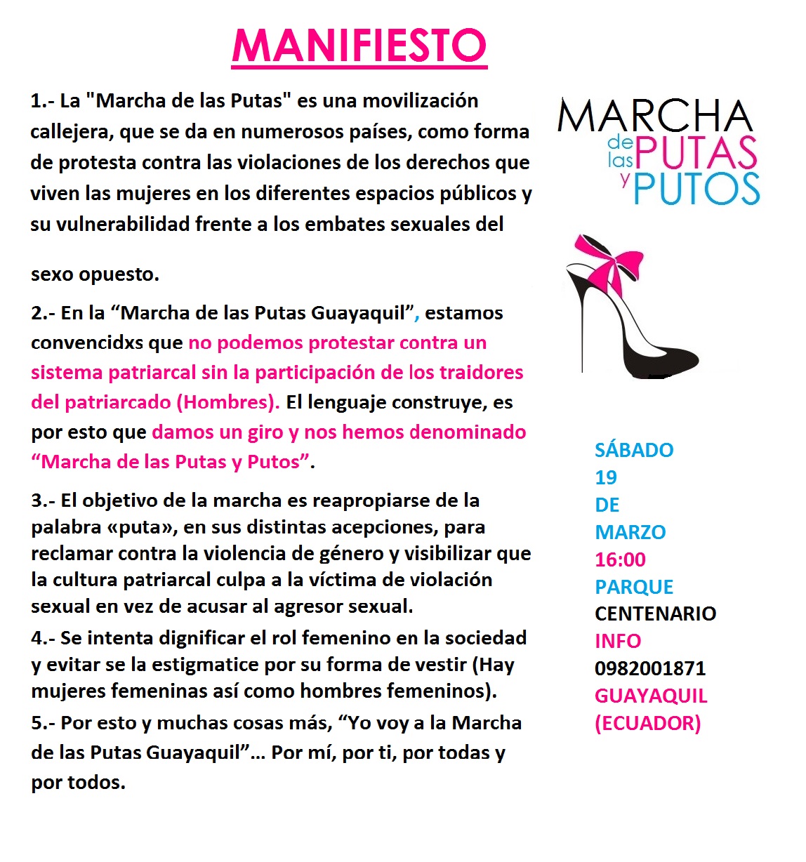 2.- En la “Marcha de las Putas Guayaquil”, estamos convencidxs que no podemos protestar contra un sistema patriarcal sin la participación de los traidores del patriarcado (Hombres). El lenguaje construye, es por esto que damos un giro y nos hemos denominado “Marcha de las Putas y Putos”.