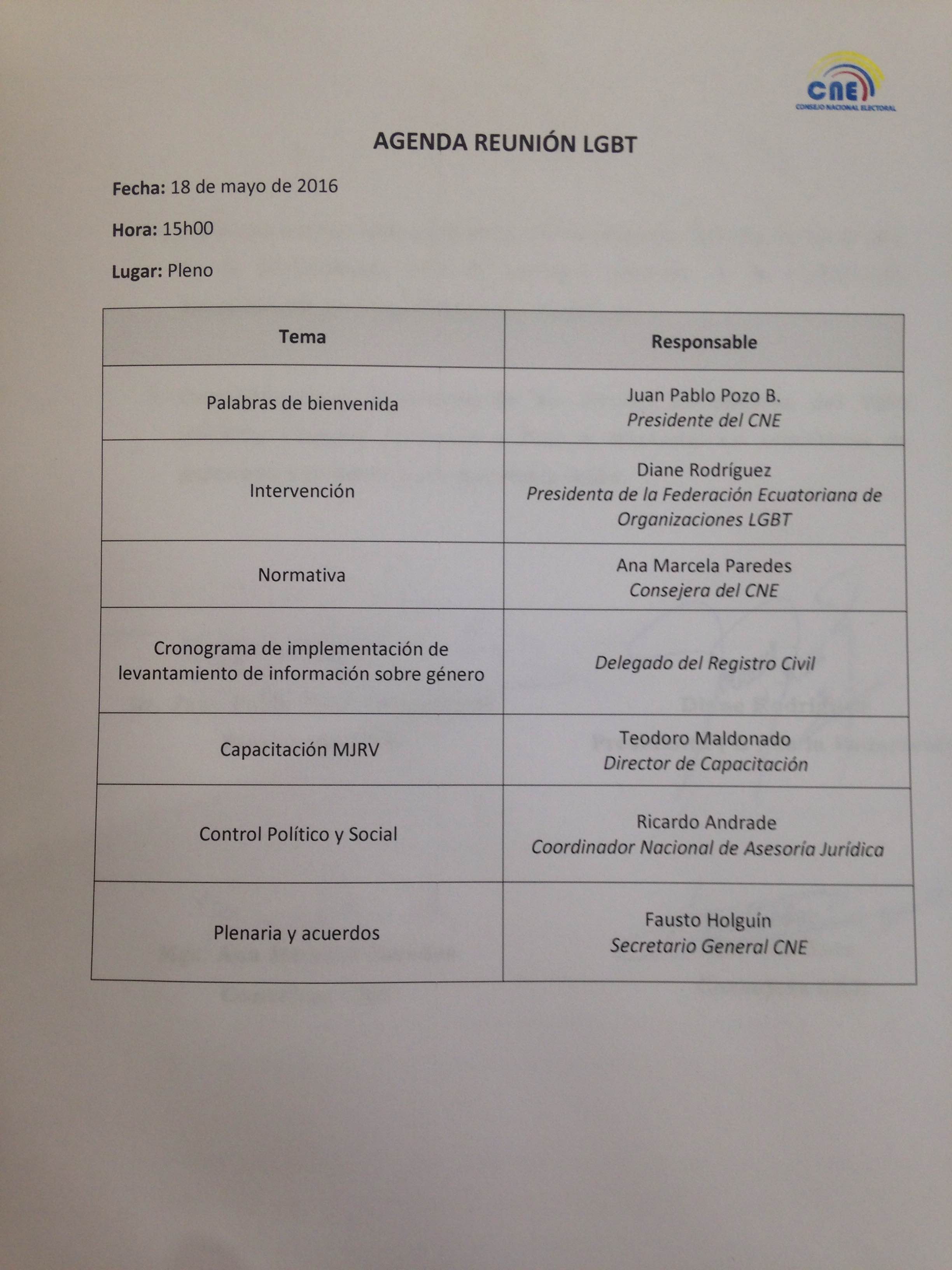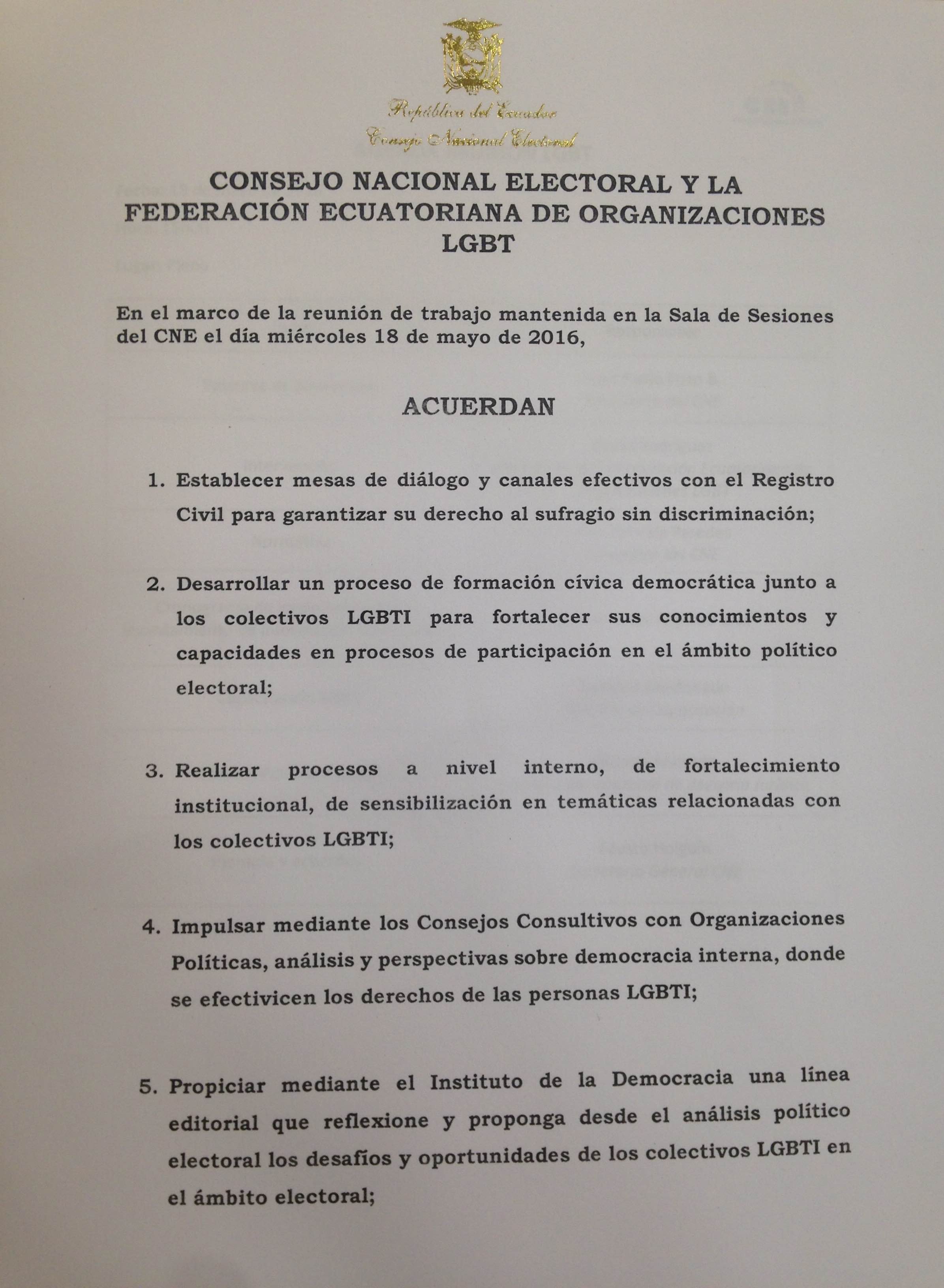 El Consejo Nacional Electoral y la Federación Ecuatoriana de Organizaciones LGBT, en el marco de la reunión de trabajo en la Sala de Sesiones del CNE el día miércoles 18 de mayo de 2016,