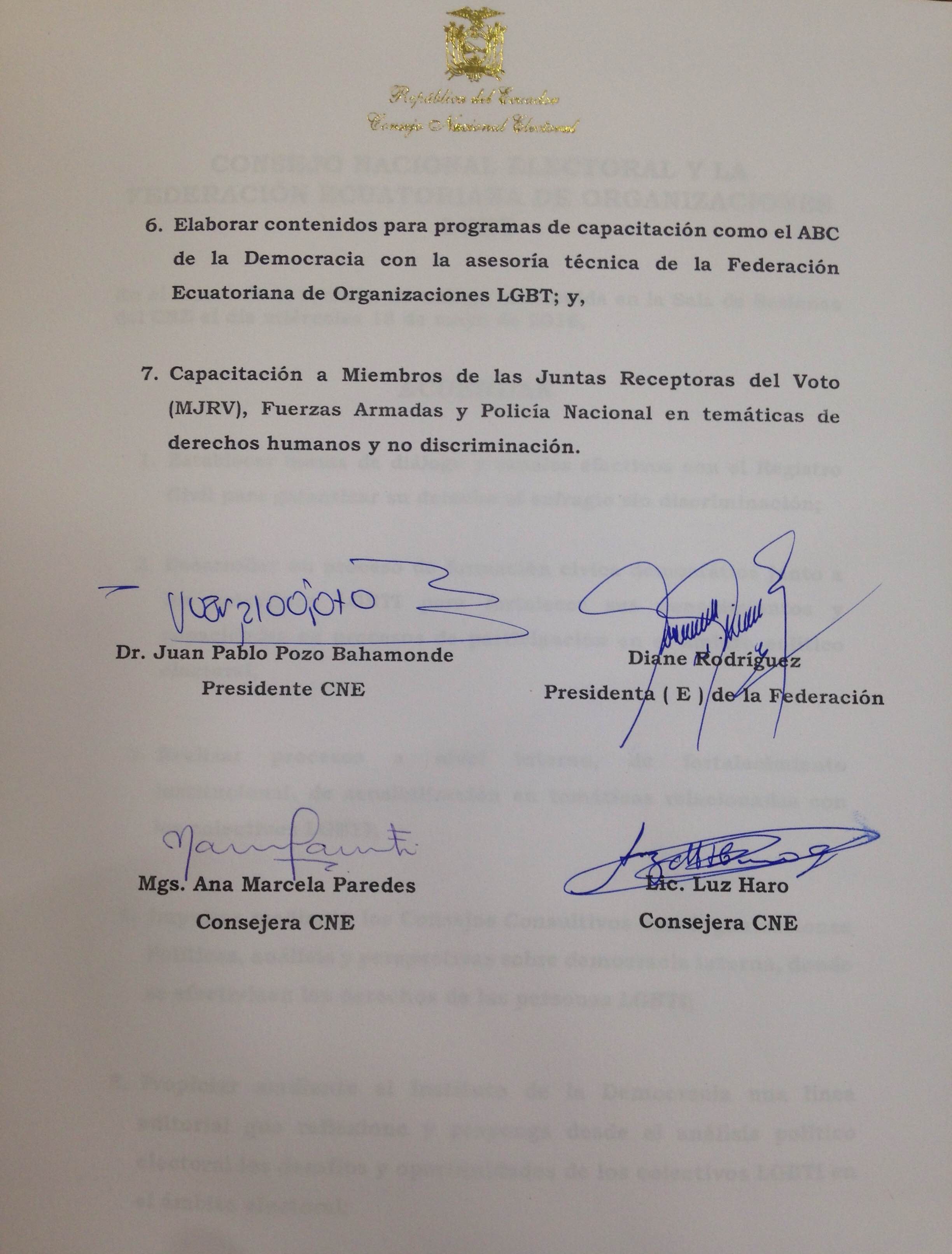 NATIONAL ELECTORAL COUNCIL AND THE FEDERATION SIGNED AGREEMENTS IN FAVOR OF RIGHTS OF ECUADOR LGBTI