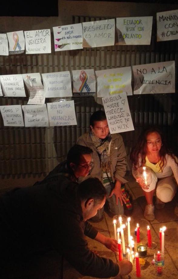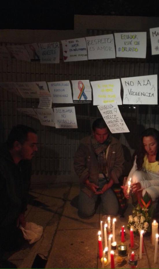 Nos solidarizamos con las familias de los asesinados y de aquellos LGBTI que se encuentran heridos. En conmemoración realizamos un plantón donde encendimos unas velas por los asesinados ayer domingo a las 18:00 al pie de la Embajada de los Estados Unidos, en Quito – Ecuador.
