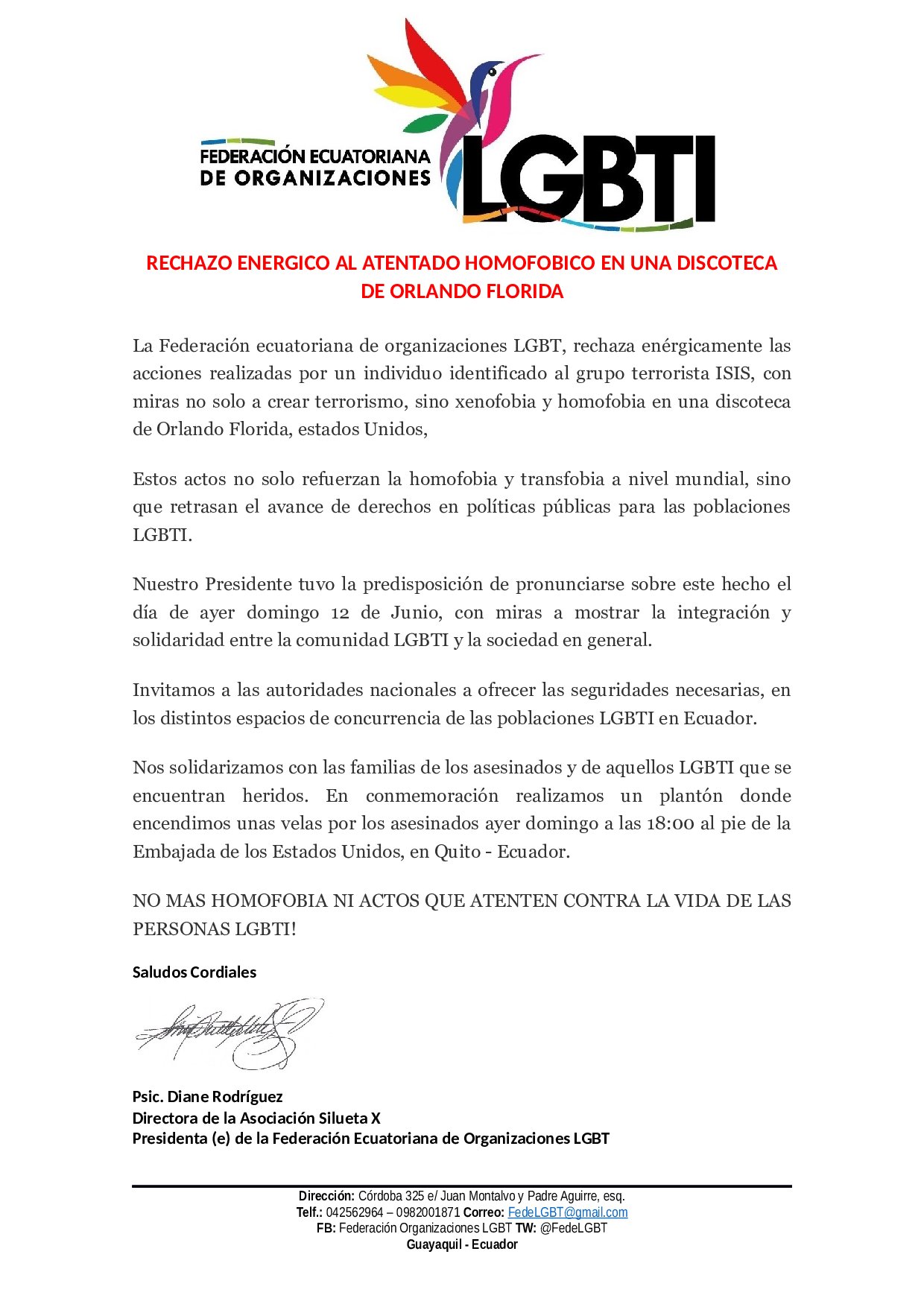 La Federación ecuatoriana de organizaciones LGBT, rechaza enérgicamente las acciones realizadas por un individuo identificado al grupo terrorista ISIS, con miras no solo a crear terrorismo, sino xenofobia y homofobia en una discoteca de Orlando Florida, estados Unidos,