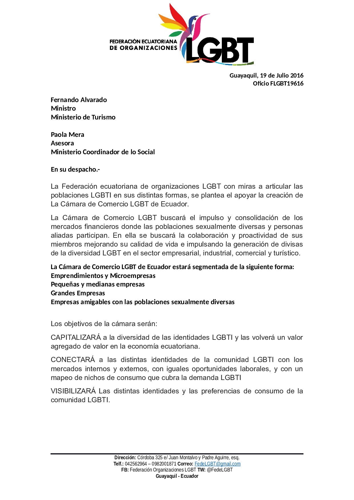 To this effect the Ecuadorian Federation of LGBTI organizations, calls for natural and legal LGBTIs and allies of generic sex populations, carrying out an economic activity related to goods or services, to enroll in our Basic registration: Name company / business, type of business / enterprise, RUC (if any), address, city, state, email and phone FedeLGBT@gmail.com