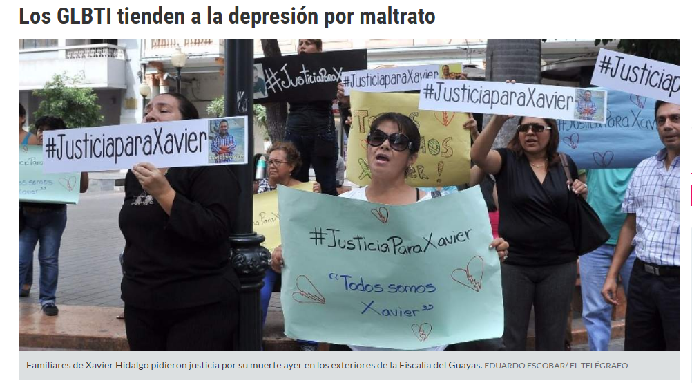 La psicóloga me decía que podía superarlo siempre y cuando yo lo quisiera, pero no fue fácil, porque aquí me encuentro solo y caí en un cuadro depresivo. Mi familia vive en Estados Unidos”, relató. Andrés participó ayer en un plantón, en los exteriores de la Fiscalía, en el que se pedía justicia para Xavier Hidalgo, quien la semana pasada fue hallado sin vida y desnudo en la vía Durán-Yaguachi. Hidalgo era abiertamente homosexual, razón que llevó a su familia a presumir que haya sido un asesinato por homofobia.