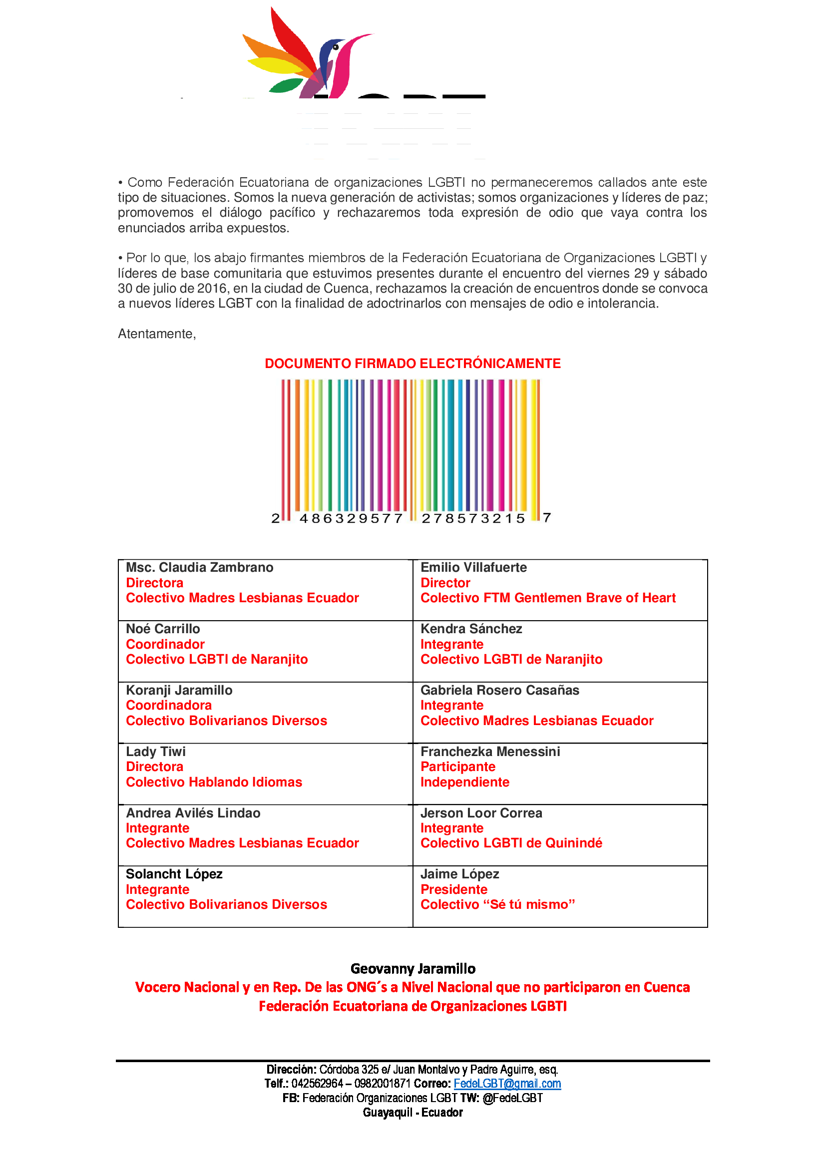 - Por lo que, los abajo firmantes miembros de la Federación Ecuatoriana de Organizaciones LGBTI y líderes de base comunitaria que estuvimos presentes durante el encuentro del viernes 29 y sábado 30 de julio de 2016, en la ciudad de Cuenca, rechazamos la creación de encuentros donde se convoca a nuevos líderes LGBT con la finalidad de adoctrinarlos con mensajes de odio e intolerancia.
