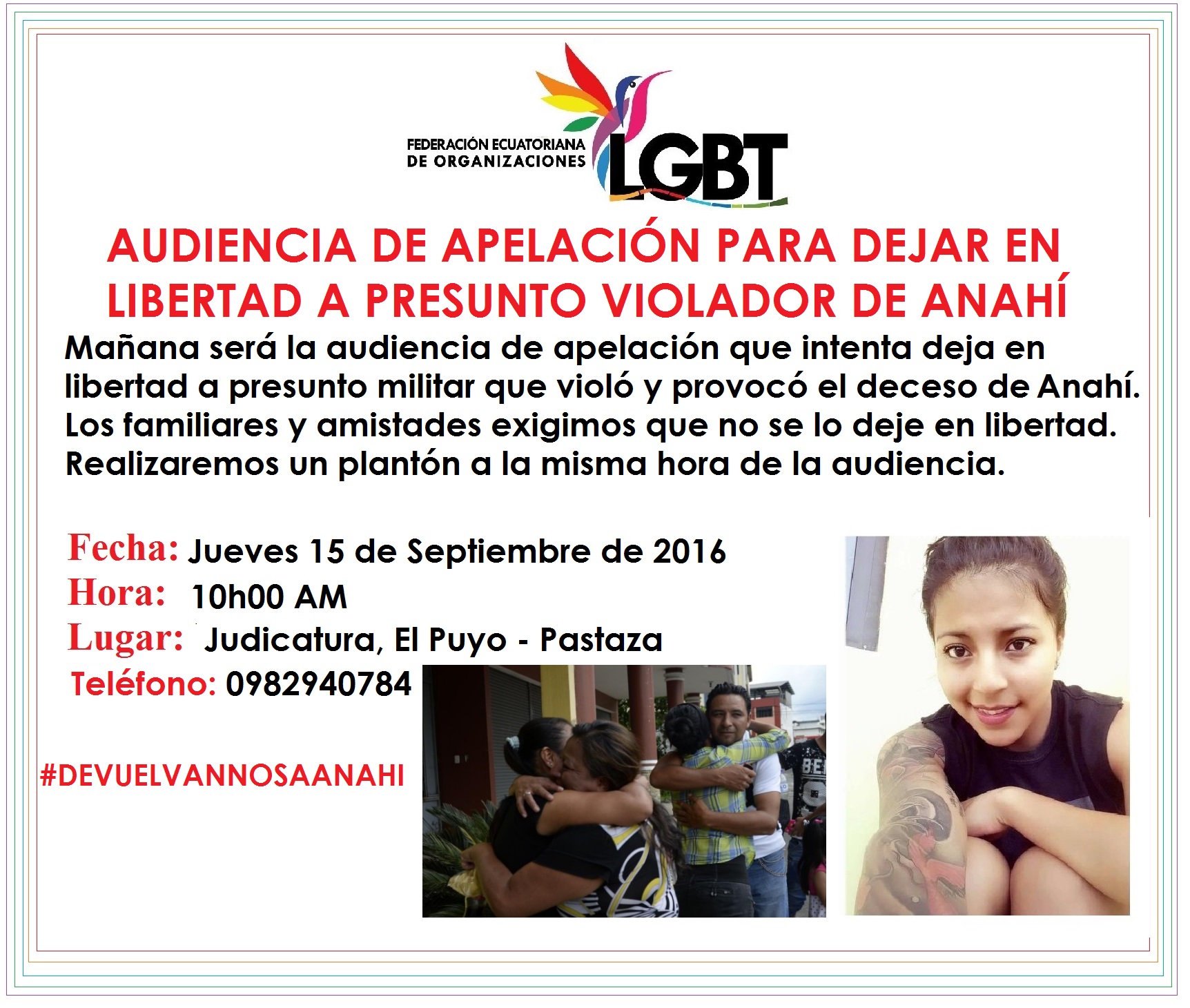 Mañana será la audiencia de apelación que intenta deja en libertad a presunto militar que violó y provocó el deceso de Anahí. Los familiares y amistades exigimos que no se lo deje en libertad. Realizaremos un plantón a la misma hora de la audiencia.