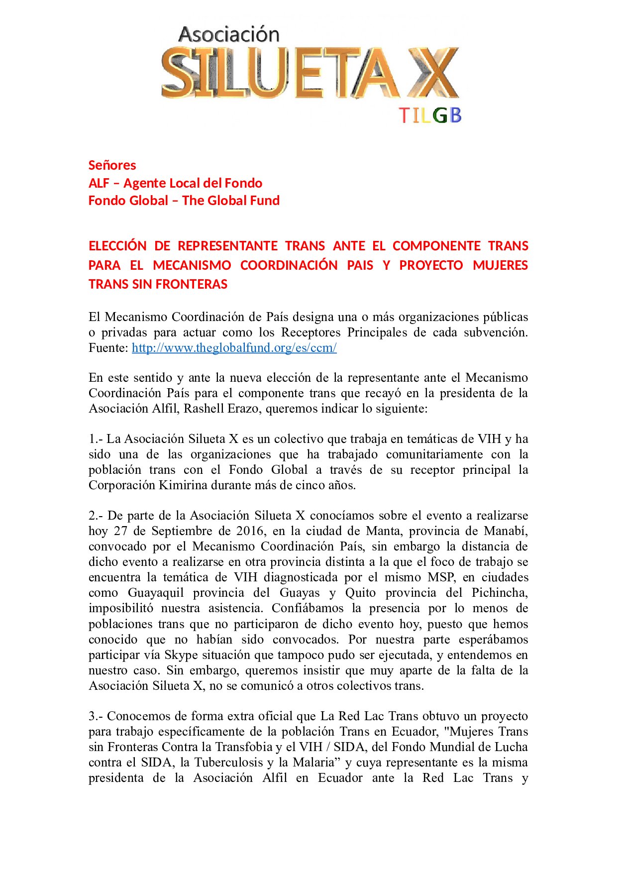 2.- De parte de la Asociación Silueta X conocíamos sobre el evento a realizarse hoy 27 de Septiembre de 2016, en la ciudad de Manta, provincia de Manabí, convocado por el Mecanismo Coordinación País, sin embargo la distancia de dicho evento a realizarse en otra provincia distinta a la que el foco de trabajo se encuentra la temática de VIH diagnosticada por el mismo MSP, en ciudades como Guayaquil provincia del Guayas y Quito provincia del Pichincha, imposibilitó nuestra asistencia. Confiábamos la presencia por lo menos de poblaciones trans que no participaron de dicho evento hoy, puesto que hemos conocido que no habían sido convocados. Por nuestra parte esperábamos participar vía Skype situación que tampoco pudo ser ejecutada, y entendemos en nuestro caso. Sin embargo, queremos insistir que muy aparte de la falta de la Asociación Silueta X, no se comunicó a otros colectivos trans.