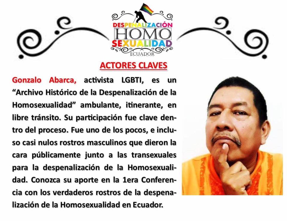 Gonzalo Abarca, activista LGBTI, es un “Archivo Histórico de la Despenalización de la Homosexualidad” ambulante, itinerante, en libre tránsito. Su participación fue clave dentro del proceso. Fue uno de los pocos, e incluso casi nulos rostros masculinos que dieron la cara públicamente junto a las transexuales para la despenalización de la Homosexualidad.