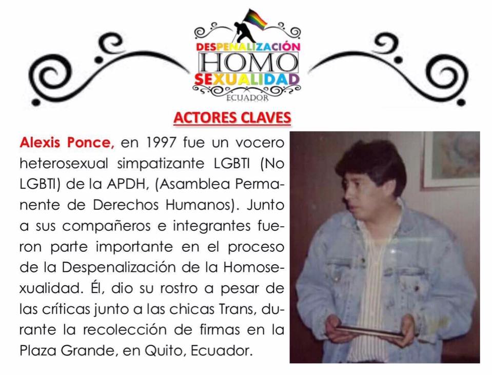 Alexis Ponce, en 1997 fue un vocero heterosexual simpatizante LGBTI (No LGBTI) de la APDH, (Asamblea Permanente de Derechos Humanos). Junto a sus compañeros e integrantes fueron parte importante en el proceso de la Despenalización de la Homosexualidad. Él, dio su rostro a pesar de las críticas junto a las chicas Trans, durante la recolección de firmas en la Plaza Grande, en Quito, Ecuador.
